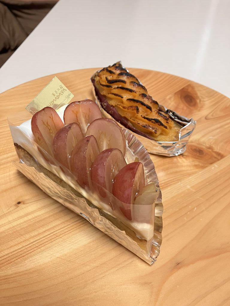 日曜日のお昼ごろ、週末の甘い癒しを求めて伺いました。ショーケースの中には秋の味覚がいっぱい!シマダヤさんに来ると、いつも季節を感じる商品がたくさん並んでいて、どれにしようかかなり迷っちゃいます。数分間の熟考の末、今回は「クインルージュのタルト」と「スイートポテト」を購入。帰宅後、コーヒーと一緒に3時のおやつにいただきました。まずはタルトから。この他にも数種類タルトがあったのですが、初めて目にしたクインルージュが決め手になりました。シマダヤさんのタルト生地は、ザクっとした香ばしい外側と、中のしっとりほろりとしたフィリングが特徴です。みずみずしいクインルージュと、カスタードクリームの甘さがぴったり。とても美味しかったです。スイートポテトはサイズによってお値段が違うので、自分で食べたい大きさを選べるのが嬉しいです。私は中くらいのサイズを選択しました。さつまいもをくり抜いた中にスイートポテトが入っていて、器ごといただけます。甘さ控えめでおいもそのもののお味が楽しめます。いつ伺っても、新作のケーキが必ずと言っていいほどあるの、毎回どんなケーキに出会えるか楽しみです。美味しい幸せをありがとうございました。ごちそうさまでした~。