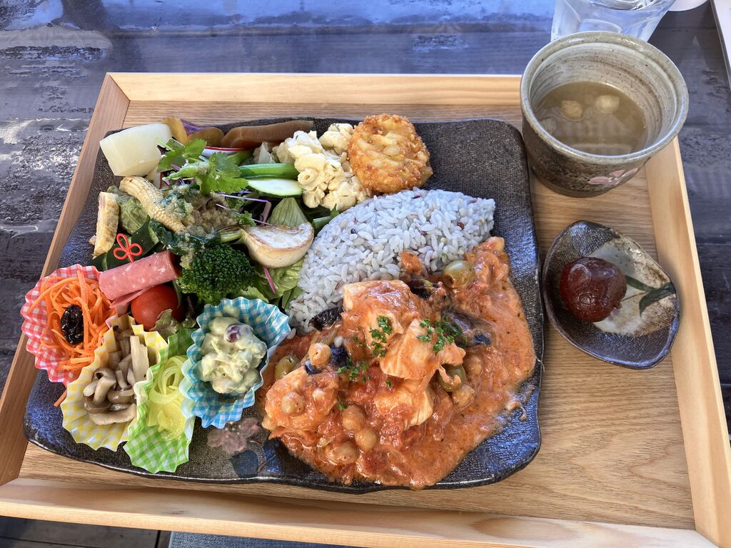 良く晴れた土曜日、お昼ごはんをいただきに「猫と橋」さんに神様と一緒に伺いました。先週はお休みだったし、たくさんお客さんがいて入れなかったらどうしよう…と思っていましたが、土曜日は比較的空いているようで、無事に車を止められました。SNSを拝見して気になっていた新メニュー「イタリアンライス鶏胸肉のトマト煮込みプレート1500円」を神様が、私は「ポークソテープレート(バルサミコ酢)1500円」をいただくことに。少し寒かったせいか、この日の猫さんはクロちゃんしかいませんでした。待っている間、クロちゃんをなでなでしていたら、しっぽをぴーんと立てておしりを出してくるので、軽くぽんぽんしてあげると「もっともっと~」という感じで気持ち良さそうにしてくれます。可愛いな~と和んでいる間に、プレートが運ばれてきました。いつにも増してサラダがもりもりなのは気のせい?すごいボリュームに圧倒されちゃいます。そして、ボリュームだけでなく、たくさんの種類の食材を美味しく調理されていて、毎回お値段以上の満足感を味わえます。ポークソテーは数種のソースから選べて、お気に入りはバルサミコ酢。ちょっとリッチな味わいです。神様のイタリアンライスも味見させてもらいましたが、トマトソースの中にはとろ~りチーズがたっぷり。鶏肉も柔らかくて美味しいのはもちろん、オリーブやひよこ豆もたっぷり入っていて、すごく美味しかったです。目の前に広がる那珂川の美しい景色に魅了されつつ、素敵な時間を過ごすことが出来ました。来月も営業されるのかな?できれば冬期休業前に、もう一度猫さんたちに会いに来たいです。美味しい幸せをありがとうございました。ごちそうさまでした~。