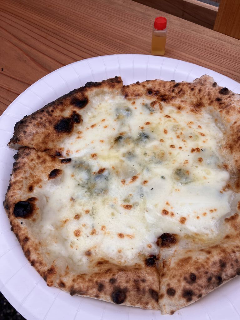 株式会社Growさん主催のクリスマスマルシェに出店されていました。イベントでもちゃんと石窯を持参されているので、あっつあつの美味しいピザがいただけます。この日は数種類あるピザの中から「クアトロフォルマッチ」をいただきました。モンテさんはピザの種類が豊富なので、もしかしたら超定番のクアトロフォルマッチは初めていただくかもです。別添えではちみつもいただき、食べる直前にかけていただきました。とろ~りチーズにはちみつの甘さ、ゴルゴンゾーラの香りがたまらない~。あまりの美味しさに、あっという間に完食しちゃいました。お店の方では、期間限定で7種のチーズを使ったピザもあるとか!そちらも気になるので、終わってしまう前にいただきに伺いたいと思います。美味しい幸せをありがとうございました。ごちそうさまでした~。