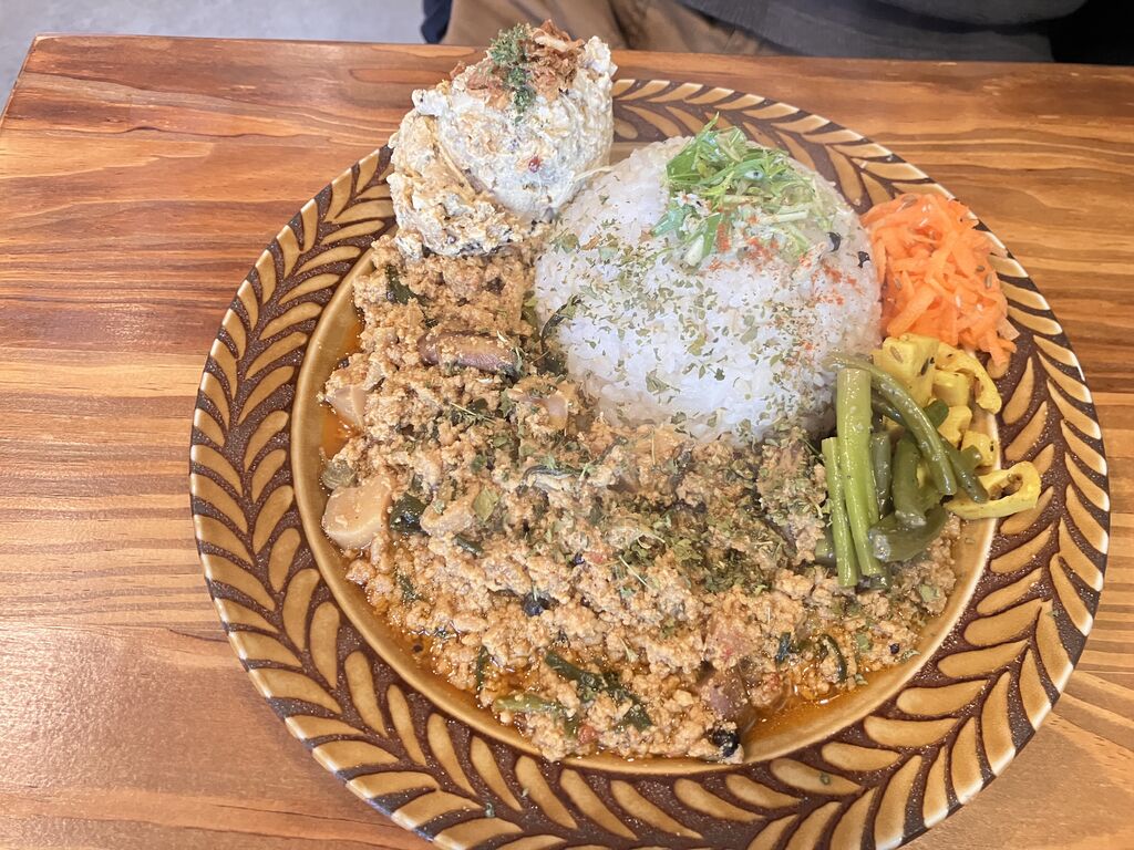 またブラウンさんでカレーが食べたい!前回の訪問からずーっとそう思っていて、やっと伺うことができました。私は「カフェモカチキン1200円」を、神様は「ニラと椎茸のキーマ1200円+サバエッグ300円」を注文。「フルーツラッシー(ブルーベリー)400円」もいただくことにしました。まずは、ラッシーが先に届いたので、ぐるぐるとかき混ぜてからいただきます。甘さ控えめなラッシーに、ブルーベリーがよく合います。そうこうしているうちに、カレーがやってきました。見た目の華やかさに、思わず「おぉ…」と歓声がこぼれます。ひとくちいただくと、スパイシーな香りが一気に広がり、食欲全開!柔らかなチキンに、隠し味のブラックチョコがいい味出してます。神様のキーマも味見させてもらいましたが、結構おっきな椎茸がごろごろと入っていてびっくり。濃縮された旨味が何とも言えない美味しいさ。はじめていただいたサバエッグも、めっちゃ美味しかったです。毎日のようにSNSをチェックしていますが、こんなアイデアどこから出てくるんだろう?というくらい、メニューのレパートリーの多さに驚くばかりです。近くにあったら、毎週のように通っちゃうだろうなってくらい好きなお店です。美味しい幸せをありがとうございまいた。ごちそうさまでした~。