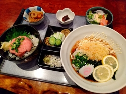 久しぶりの「ゆるりや」さん♪ここに来たら、うどんセットか、丼セットですね~!(どちらも、数種類から選べる丼とうどんのセットで、どちらかが大きいです)。私が夏におすすめしたいのは、「冷やしレモンたぬきうどん」!レモンをたっぷり絞って食べるのがいいですね!檸檬の爽やかな酸味と、天かす&マヨネーズのコクが合わさって絶妙なバランスです。ゆるりやさんの冷たいうどんは、コシがあって本当に美味しいですよ!セットのネギトロ丼も、たっぷりでおすすめです。旦那さんが食べた おすすめ丼(海鮮系)と日替りうどん(肉うどん)も良かったです!