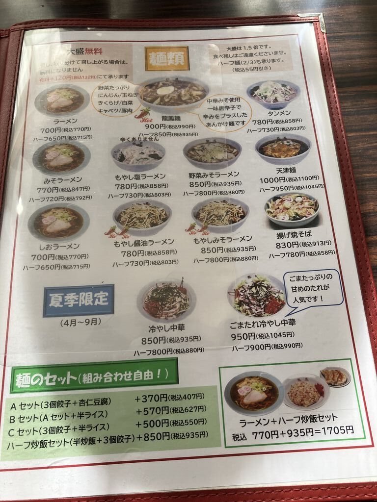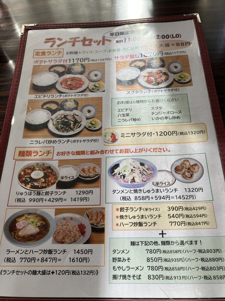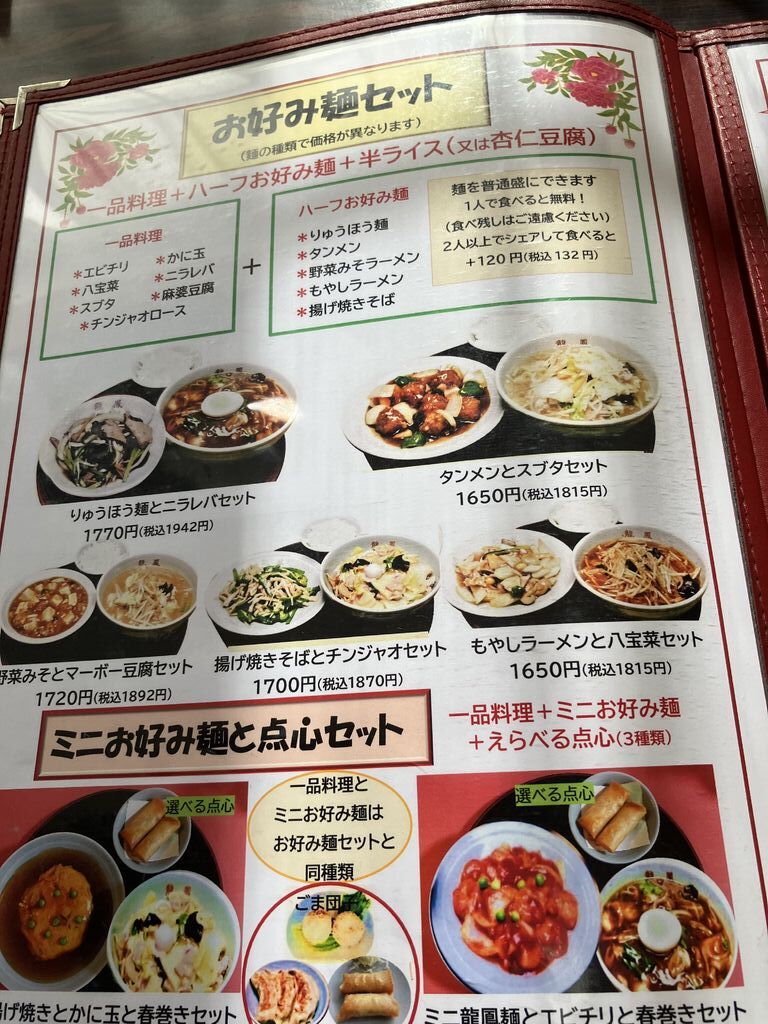 昼ピーク後の13時過ぎに訪問しました。お客様は途絶えることなく、常に4~5組訪問されています。メニューはご飯物と麺類の単品とともにランチセット、(定食、麺類)、ラーメンセット、お好み麺セットのセットがいろいろあり、そして期間限定メニュー、点心等と豊富です(ラーメンは大盛無料です)。本日はチャーハンとタンメンを注文しました。チャーハンは彩り鮮やかで、刻んだナルトと玉子の赤色と黄色が映えて見た目にもおいしそう。昔ながらの懐かしさを感じる味で、個人的には好きな味です。付け合わせの紅しょうがが多めに盛り付けてあり、箸休めにもってこいでした。タンメンのスープはやさしい味で、盛り付けの野菜はシャキシャキしており満足です。また、700円以上の食事を注文だするとワンドリンク1杯がセルフでサービスになっていました。ホットもアイスもあるのでお好きなものを選べます。店の奥に座敷もあり、大人数での宴会もできるようで、外見よりも広い店内でした。