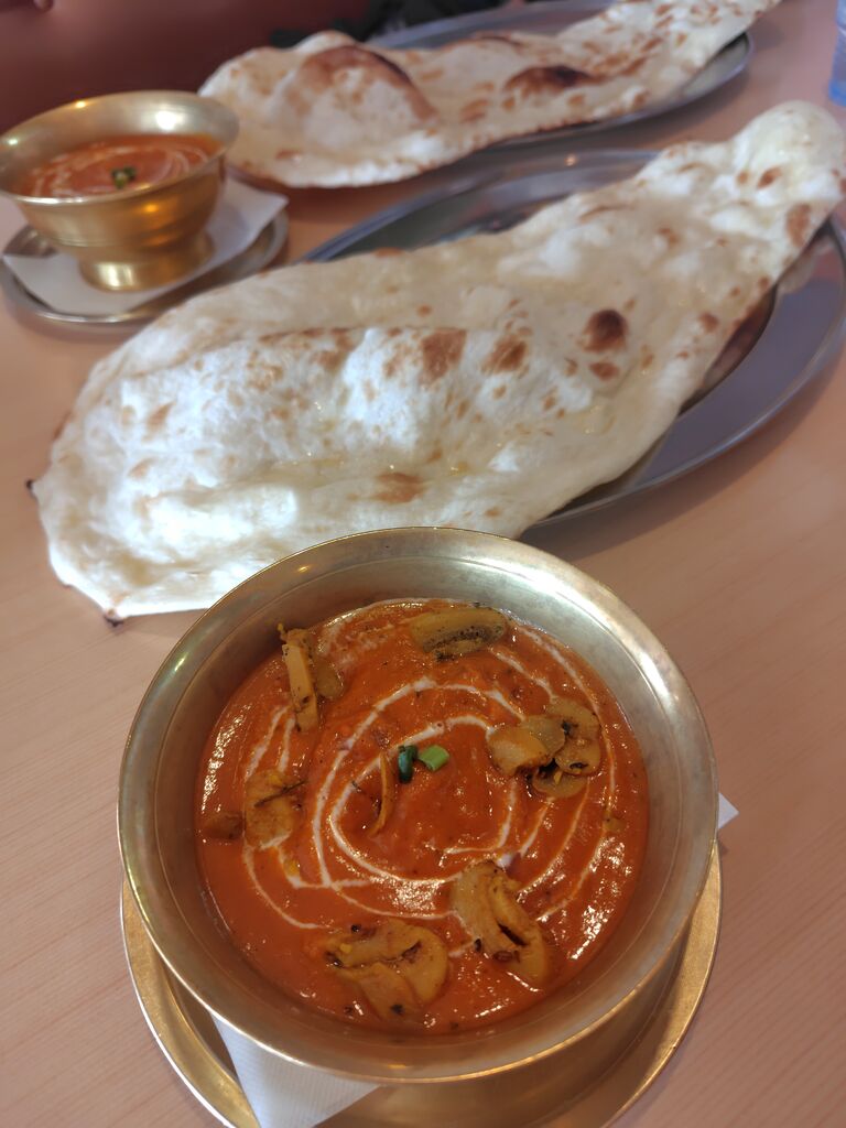 前回より、かなり間が空いてしまって、お久しぶりに来店★★ようやくEVERESTさんで、ランチ♡してきました。お昼時で、車がいっぱい。ちょっとだけ待ちました。今日の日替わりはチキンとマッシュルームでしたよ(^^) もちろん、ナンをチョイス♡ラッシーも♡大好き〜٩(๑´0`๑)۶2辛にしました。一緒に行った先輩はキーマカレー、3辛です。焼きたてナンが大きいからびっくりするけど、甘くて食べやすいから、どんどんいける(笑)おかわり自由ですよ〜♪お腹と相談したら、もうちょいいけそうだったので、ハーフサイズのナン追加投入(笑)私は2辛大丈夫だったのですが、次は3辛かなぁ?先輩は更に上を目指すって(笑)5辛に挑戦?? お得感満載で、店員さんも優しいです。ごちそうさまでした〜♪美味しく頂きました♬