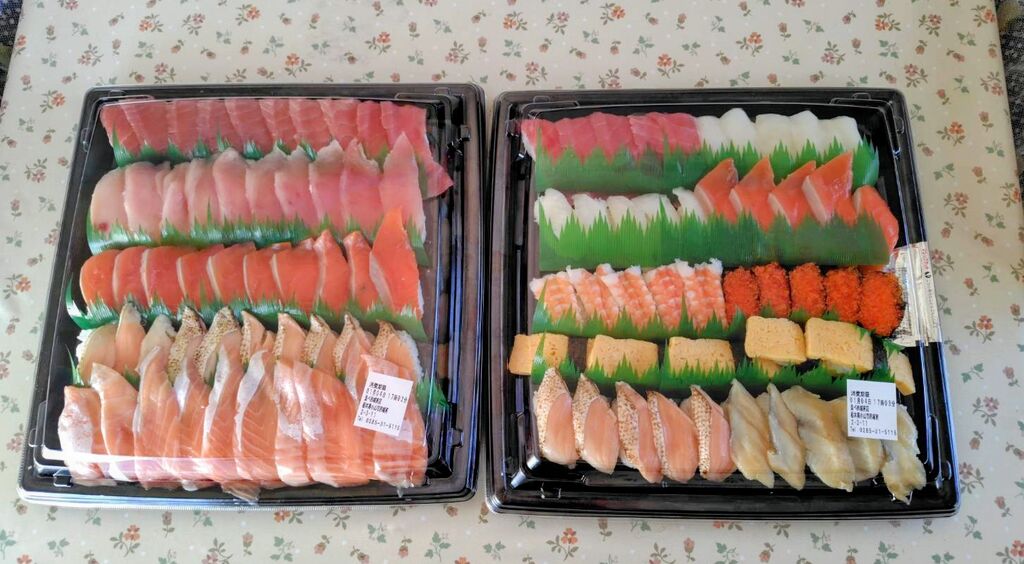 新年、我が家に親戚が集まり、総勢8人。事前に予約して魚べいさんで、『あかり』5人前 『サーモンまぐろづくし』5人前、計10人前をテイクアウトしました。海老、まぐろ、イカ、玉子、穴子などの定番メニューと、みんな大好きサーモン&まぐろがど~ん!! いっせいに食べ始めて、あっと言う間に完食しちゃいました(笑)お店で食べるのも良いですが、テレビを見ながら、お正月みんなで、ワイワイしながら食べるのも格別です(^^) ネタも新鮮、大きくてお腹いっぱい、大満足でした(*´ڡ`●) 大変美味しく頂きました❢ごちそうさまでした♡