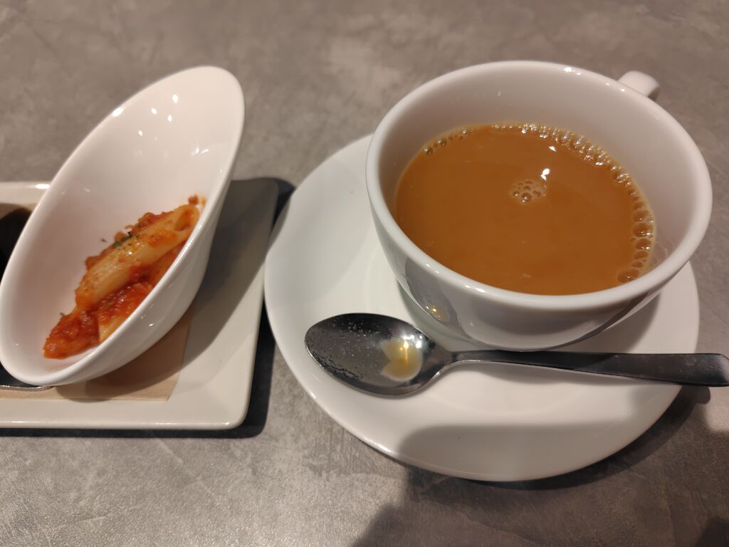 大きいりんごが、目印!!久しぶりにランチしました(*^^*)注文したのは、ベスピオ(海老入り辛いトマトソース)ランチセットです!たくさんメニューがあるので、迷っちゃいました〜★パスタの他にもグラタンやドリアもあります(^^)ベスピオって、火山っていう意味らしいです❢細麺のパスタはアルデンテ!! トマトソースは、しっかり濃くて、にんにく効いて、ガツンと来ちゃった(笑)プラストマトの甘さ♡そして、メインの写真を撮るの忘れる私…。やらかした(T_T)お腹空き過ぎていたよ〜(汗)ランチセットは、嬉しい前菜とドリンク付き♡サラダの手作りドレッシングが美味しすぎる♪オニオングラタンスープに、ペンネでした♡ドレッシングは、販売もしてましたよ〜!! 15時からは、ドルチェで、ティータイムも楽しめるそうです❢その日の気分で、パスタが選べるからまた伺いたいと思います(*´ڡ`●)ごちそうさまでした!美味しく頂きました☆彡