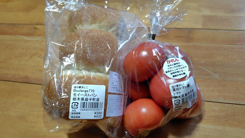 今回は「ばぁすちー」「生イーストパン」「トマト」「おからドーナツ」「アイスクリーム(ずんだ)」を購入しました。ばぁすちーは、益子町ゆかりの陶芸家がイギリスで愛した手作りパイを再現したもので、とても具だくさんで不思議な食感の美味しいパイです。おからドーナツはもちもち、アイスクリームのずんだは素朴な甘さでした。生イーストパンで作ったフレンチトーストは、しっとりふわふわに出来上がりました。トマトのかれんというこの品種は、甘みと酸味のバランスが抜群で、驚きの美味しさでした。