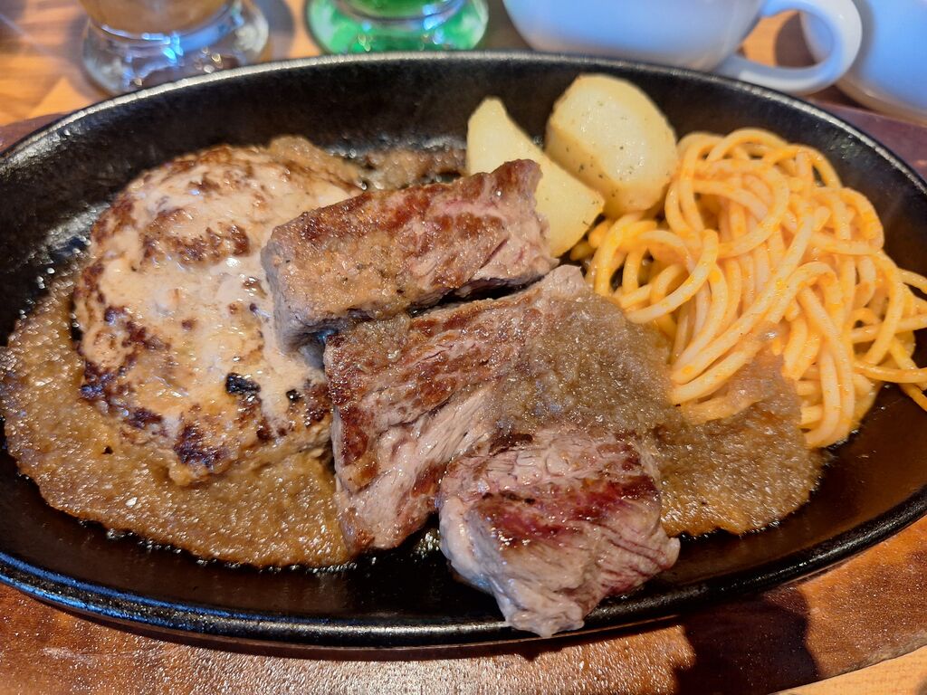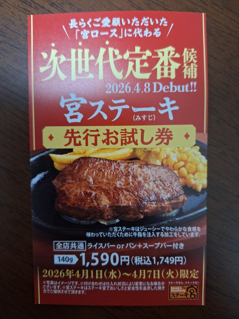 法事の後、親族でランチに訪問☆稀少部位に惹かれ、“宮ハンバーグ120g&チャックテールフラットカットステーキ80g”をチョイス♪柔らかい肉質でさっぱりとした味わいです。ランチセットにライスとスープーバーが付いていて、更にドリンクバーとサラダバーまで付けちゃいました。サラダバーにはコーヒーゼリーやわらび餅のデザートもあり、テンションが上がり、皆食べすぎてしまいました。下の子は小学校卒業なので、最後のキッズメニューを味わっていました。宮ステーキの先行お試し券をいただいたので、また食べに行きたいです(^ー^)