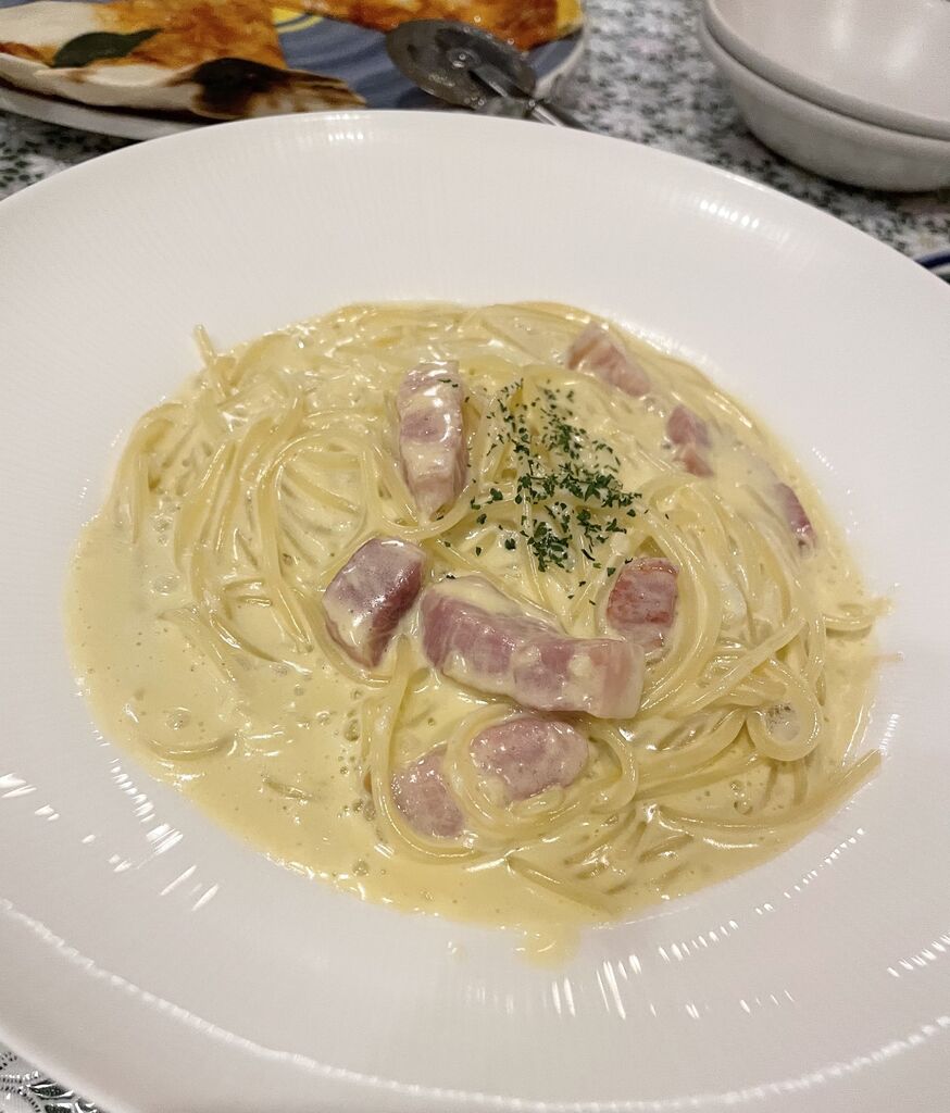 友人と久しぶりにジョイア・ミーアさんへ。私はここに来たら毎回カルボナーラです。友人たちはマルゲリータと写真はないですがポルチーニのパスタを注文です。クリーム系のパスタは本当にコッテリ濃厚で、濃い味を欲していた私にはピッタリ。3人でシェアしましたが、クリスピータイプのマルゲリータは生地がパリパリでチーズたっぷり。ポルチーニのパスタは濃厚ソースに大きめの海老が入っています。土地柄的にランチタイムは混雑が予想されますが、平日のディナータイムだったので落ち着いて食事をすることができました。小さいお子様連れのご家族からご年配のご夫婦など様々な年代の方がお食事を楽しんでいらっしゃいました。