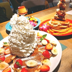 以前勤めていた職場の仲間と女子会で利用しました。コナズ珈琲初めての訪問です。早めに行ったのでまだ駐車場が空いていて助かりました。満車の時は直ぐ隣にある総合運動公園の有料駐車場を利用しましょう。宇都宮にいる事を忘れてしまいそうな店内は開放感があって、席もゆったりしています。ハワイアンな置物もたくさん飾ってあります。私は1番人気のいちごとバナナのパンケーキをチョイス。見た目のインパクト大です。運ばれて来た時に山盛りホイップクリームとお皿の大きさに驚愕(笑)残念ながら完食できず(T_T)次回は数人でシェアして食べたいと思います。