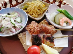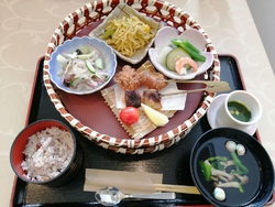 人間ドック終了後の昼食をいただきました。メニューは決まっているようで本日は[特製彩り御膳]です。その名の通り彩り良く美味しそう♪串焼きされた銀鮭と夢ポークヒレ肉の串カツは一口大で食べやすく添えられたレモンを絞ってさっぱりと美味しいです。切り干し大根がカレー味だったり茶碗蒸しにモロヘイヤのソースがかかっていたり…自分でも作ってみたくなるような料理です。メニュー表の裏側にはレシピもあって分かりやすく親切ですね♪食後のデザートとアイスコーヒーをいただきながらホッと一息…管理栄養士さん監修の[特製彩り御膳]は栄養バランスやカロリーも計算されカラダに優しく美味しい食事でした。食事と健康に気を付けてまた一年も元気に過ごせたら…と思います。ごちそうさまでした•ᴗ•ꕤ*
