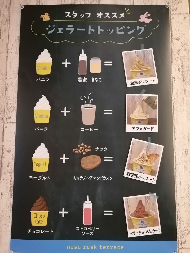 友人と[ジェラートの食べ放題]に行ってきました。雨が降る肌寒い日だから空いていると思いきや店内は満席状態…やはり人気の【那須ラスクテラス】さんですね。本日のジェラートは[ヨーグルト][ミルク][チョコレート]の他、季節限定[焼き芋]がありました。焼き芋!!嬉しい♡まずは焼き芋のジェラートに黒蜜ときな粉をトッピング&ヘーゼルナッツとシュガーのラスクをチョイスして「いただきまぁ~す♪」…美味しい♡全てのジェラートとラスクを制覇し大満足。無料でいただけるドリンクを飲みながら至福のひとときを過ごすことができました。ごちそうさまでした•ᴗ•ꕤ*