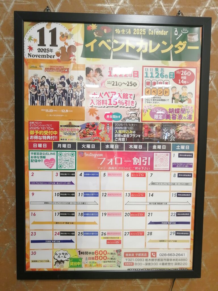 「ぜ~ったいやった方がいいって~♪」友人オススメの[アカスリ&リンパマッサージ]がこちらの【極楽湯】さん内にあるので友人と行ってきました。私は人生初の[アカスリ&リンパマッサージ]です。まずは温泉に入ってカラダを温めてからスタートです。たっぷり90分のコース…アカスリでひと皮剥けたよう隅々までツルツルスベスベ♪リンパマッサージで頭のてっぺんからつま先まで全身が整いました。終了したら友人と交代して私は再び温泉へ。いろんなお風呂がありますが長時間入っていられるぬるめの[高濃度炭酸泉]が気に入りました。お風呂から出たら[御食事処]で軽く食事もしました。こちらの【極楽湯】さんは遅くまで営業されているので時間を気にせずゆっくりできるのはありがたいですね。11/14~駐車場特設会場で[牡蠣奉行/カキ小屋]が始まるそうです。美味しそ~♪こちらで炭火焼き海鮮BBQ食べてみたいな(˶ᐢᴗᐢ˶)