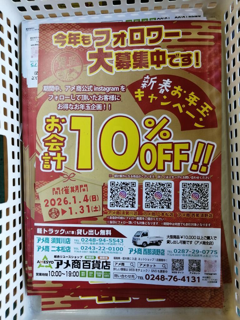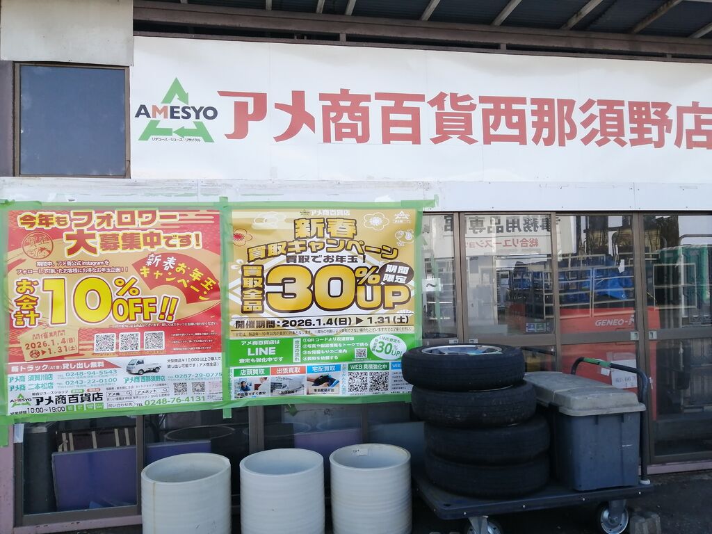 「探し物があるから一緒に見に行こう」…とのことで同行しました。国道4号線を矢板から北上した大田原市上石上にある【アメ商百貨店 西那須野店】さん。私は初訪問です。広~い建物が2棟あり本館は一般向けの家具や家電、工具、日用品、雑貨、骨董品がたっくさーん!そして別館には事務用品や書庫、ロッカー、厨房用品がたっくさーん!こんないろんなものがあるんだ~。業務用から一般用まで多種多様の商品がところ狭しと並んでおり滅多に目にすることのない店内に驚きと感動( ˙O˙ )業務用だけじゃなく一般の買取もやっているみたい。探していた品も見つかり無事購入することができたようで良かった!良かった!お買い上げで軽トラ1時間無料貸出しも可能とのこと。新品じゃなくてリユース品の探し物がある時…こちらのお店で見つかるかもしれませんね。お店の方も親切・丁寧でした。