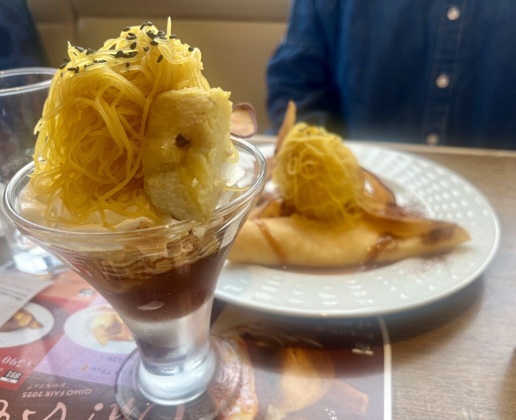 獨協面会前に娘とランチ♪おいもフェア目当てで…平日でしたが駐車場は満車。店内待ち5分で着席できました。海老とかぼちゃのあふれクリームドリアとおいもンブランのミニパフェ注文。ドリアは、かぼちゃがゴロゴロ入っていてクリーミー。想像通りの美味しさ〜♪レッドペッパーオイルで味変。そして念願のお芋シリーズスイーツ。紅はるかのモンブランクリーム,紅はるかのひとくち焼き芋,紅芋プリン,生クリームにバニラアイスのバランスが良く、娘が食べたおいもンブランクレープもとっても美味しく、満足幸せランチでした♪