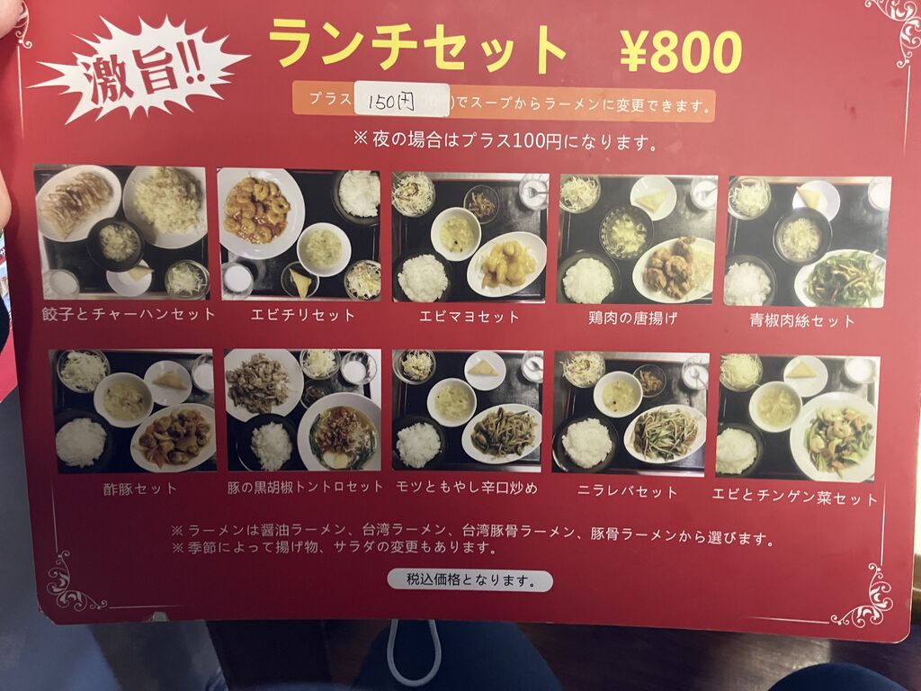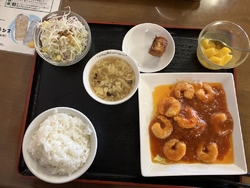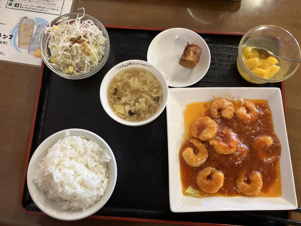 初めての来店てす。直近で来たいなと思ってたらずっとお休みでようやく来れました。ランチセットがオール800円という安さでどれにしようか迷った末エビチリセットにしました。10分位で到着。サラダ、揚げシュウマイ、デザートが付いてました。エビチリは割と辛くて自分好みの味で海老も沢山入っていて美味しく頂きました。今度機会があれば他のメニューもトライしてみたいです。ご馳走様でした。