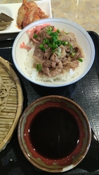 一度行ってみたかった【博多うどん なごみや】さんへ、ランチ時に伺いました。無料のドリンクバーや、無料のお漬物等々サービスが充実していました。オーダーしたメニューは¥1,150の『肉丼セット』です。麺もライスも両方楽しめて、お腹大満足です。キムチ・牛蒡・ワカメの煮物等がセルフサービスなので、ライスのお供に沢山食べました。特にキムチは、発酵食品で身体に良いのでお代わりさせてもらいました。お蕎麦のお汁に入れるネギも無料でお代わり出来るのは、嬉しい〜です。他のお客様のオーダーした舟盛りを目にしましたが、豪華で美味しそうでしたよ。