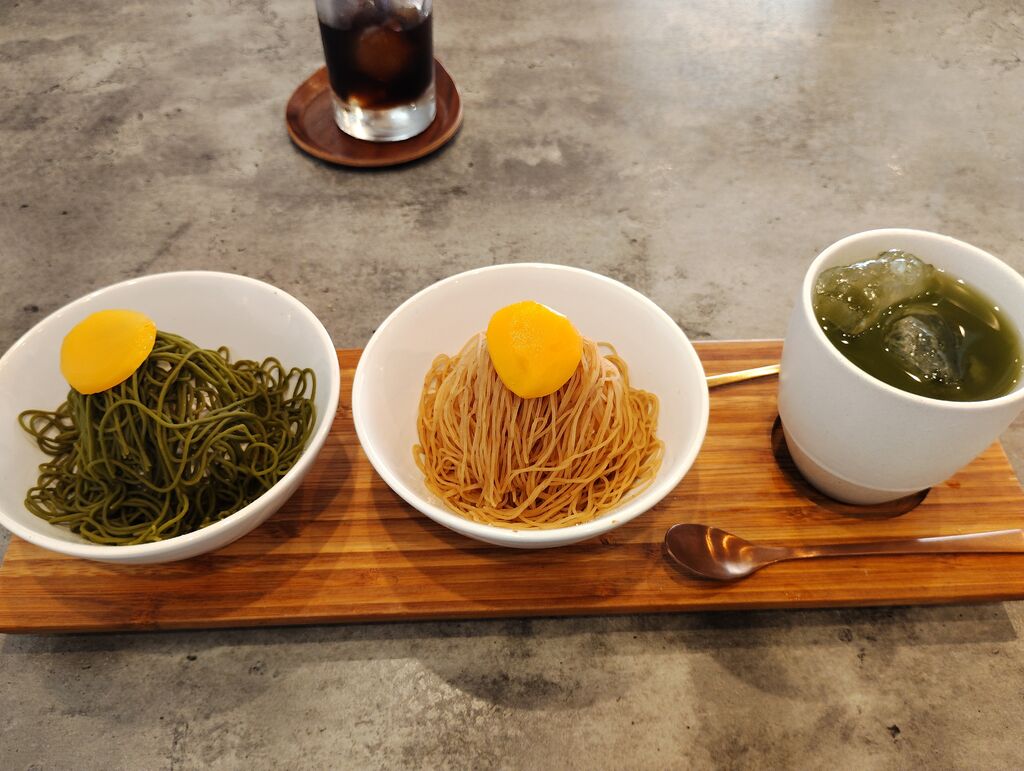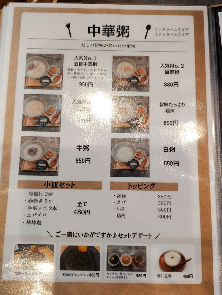 13時頃に到着しましたが、満席のようで一組待ち。受付を済ませて10分ほど待つと呼ばれたので店内へ。靴を脱いでスリッパに履き替えるスタイルはお洒落なカフェのよう。海老好きとしては、えび粥・海老三昧・エビチリ丼のどれにしようか迷っていましたが、限定メニューを発見して即決。私は限定の「アボカド中華がゆ~エビ・鶏入り」連れは「3点盛セット」を注文。モンブランも食べてみたくて「モンブラン食べ比べセット」も追加しました。“アボカド中華粥”は出汁のきいたお粥にアボカドが意外と合っていて体に染み渡る優しいお味。プリプリのエビと鶏肉も入っているので飽きない美味しさでした。しっかり味がついているのでそのままでも美味しいですが、ザーサイ・ネギ油・揚げ春巻きの皮で味変できるので色々な味が楽しめます。お粥なのでそこまでお腹は膨れないかなぁと思っていましたが、どんぶりにたっぷり入っているので結構お腹がいっぱいになります。“3点盛”は棒棒鶏・海老マヨ・油淋鶏の3点で、お肉は柔らかくて海老はプリプリで美味しい♪“モンブラン”はそれぞれ栗と抹茶の味が濃く、中のホイップは甘さ控えめで栗の味も引き立っていて絶妙な味わいでした。