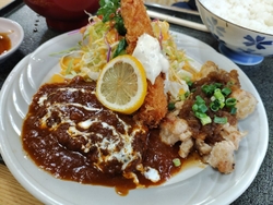 一度行ってみたいと思っていたお店で、オープンの時間に丁度近くにいたので初訪問。オープンと同時に入ったので他にお客さんはいませんでしたが、12時を回ると続々とお客さんが来ていました。私はずっと食べたかった「いさおちゃんのオムライス」連れは「本日のランチ(ハンバーグ)」を注文。“オムライス”はふんわりした卵にとろ~りとしたチーズとデミグラスソースが絶妙で美味しかったです。“本日のランチ”はハンバーグ・エビフライ・チキンソテーとメイン級が3品にコーヒーかウーロン茶がついて950円は嬉しい。お腹いっぱいで大満足のランチでした(*'▽')