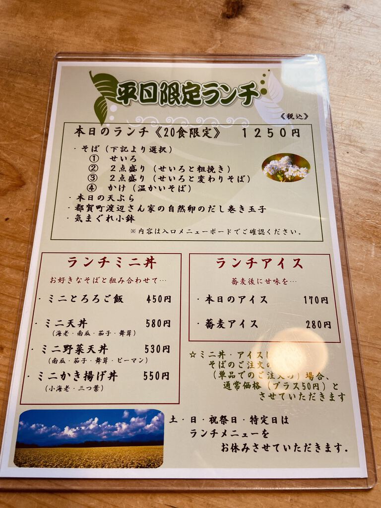義母と栃木市に用事があり、帰りにランチに行こうと、和食検索してこちらに伺いました。私は平日限定本日のランチ(1250円)でお蕎麦2点盛り。義母はランチの温かいお蕎麦。蕎麦アイス(280円)は食後にいただきました。まず最初に自分でわさびを下ろします。自分でおろしたてのわさびにもワクワク♪お蕎麦・天ぷら・小鉢・玉子焼きが乗ったお膳が机上へ。2種類のおそばは食感も違い、食べ比べしながらそれぞれの味を楽しめます。天ぷらはサクサク。小鉢も玉子焼きも美味しかった~。蕎麦アイスがこれまた美味!機会があればまた伺いたいと思います。ご馳走様でした~!