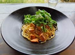 先日はお休みで行きそびれたキッチンスロープさんにお邪魔しました。「え?ここ?」って一瞬思うような細くて急な坂道をちょっとだけ登ると駐車場があります。三角形の独特な雰囲気ある建物✨店内は忙しそうでしたが、たまたま予約のお客様が来られなくなってしまったみたいで運良くすぐ入る事が出来ました。パスタが中心のメニューで私はオススメのサーモンとルッコラのアンチョビオイルパスタセット(税込2080円)、娘はワタリガニのトマトクリームパスタのセット(1650円)を頂きました。他にレンコン入りのイカスミパスタ等もあってどれも美味しそうでした♥セットにはパンとドリンク付き。デザートはインスタで見たレモンのバータルト等あってすごく気になりましたが、最近外食が多くなってしまったので今回は我慢(;_;)パスタは娘とシェアして頂きましたがどちらも美味しかったです♥外の景色が良く見えるカウンターのような席でのんびりと素敵な時間を過ごさせて頂きました。また行きたいです♥ご馳走様でした✨