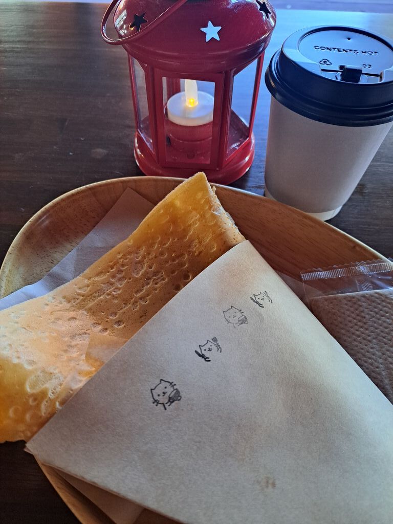 11月のLINEのドリンク付きお得なクレープ¥600(税込)『カスタードシュガー』は終了、代わりに『キャラメルシュガー』、ホットコーヒーはゲイシャを選びました クレープはまるで同敷地内のイチョウの葉と同じような色!(周囲を歩くとイチョウの葉の香りいっぱいします) イートインするにも 上着を羽織れば寒くなく、仕上がり待ち時間も癒しタイム♪ 先月、木製のプレートに提供されていて素敵!と思っていたら、今度は小さな灯りもテーブルに置かれていて、お・も・て・な・しの心が伝わります! 11月最終営業日になりましたが、伺うことができてよかったです!12月のユナイテッドガーデンでの営業日は少な目ですが、都合つけて、パリパリクレープと美味しいコーヒーをいただきに行きたいです