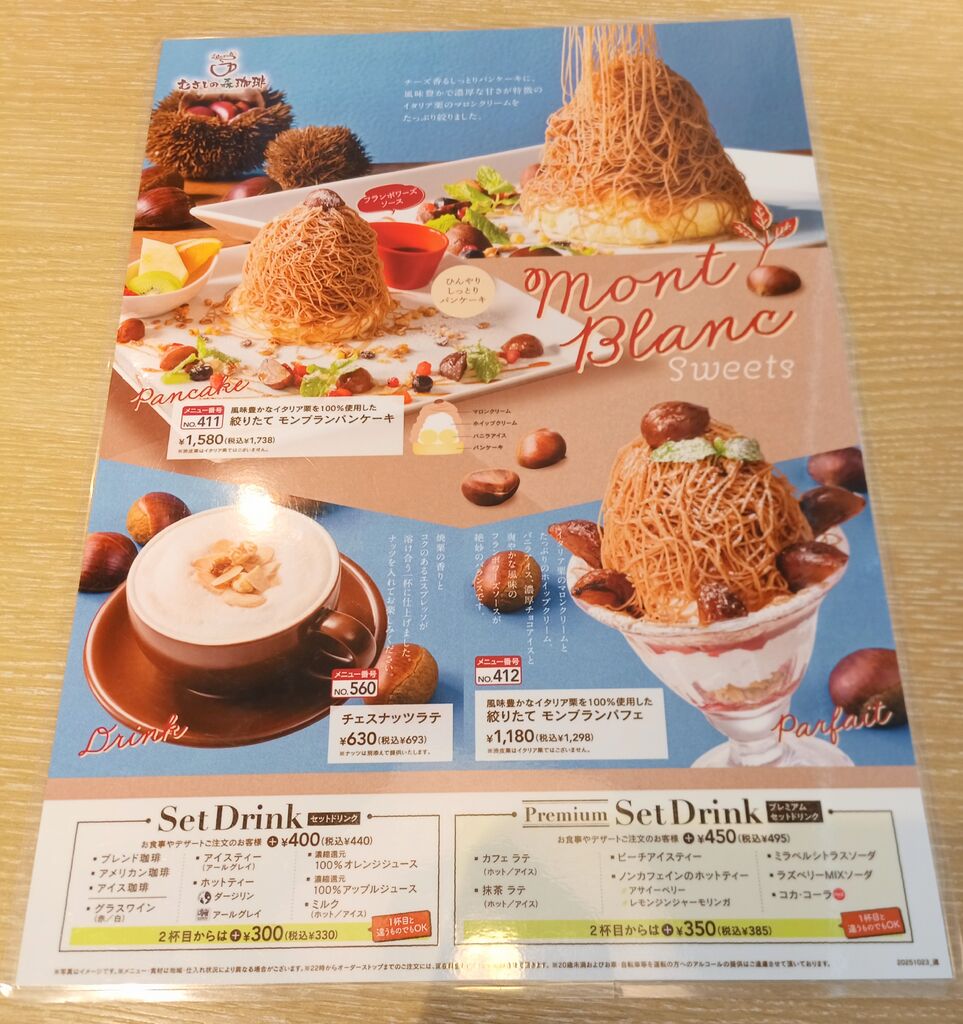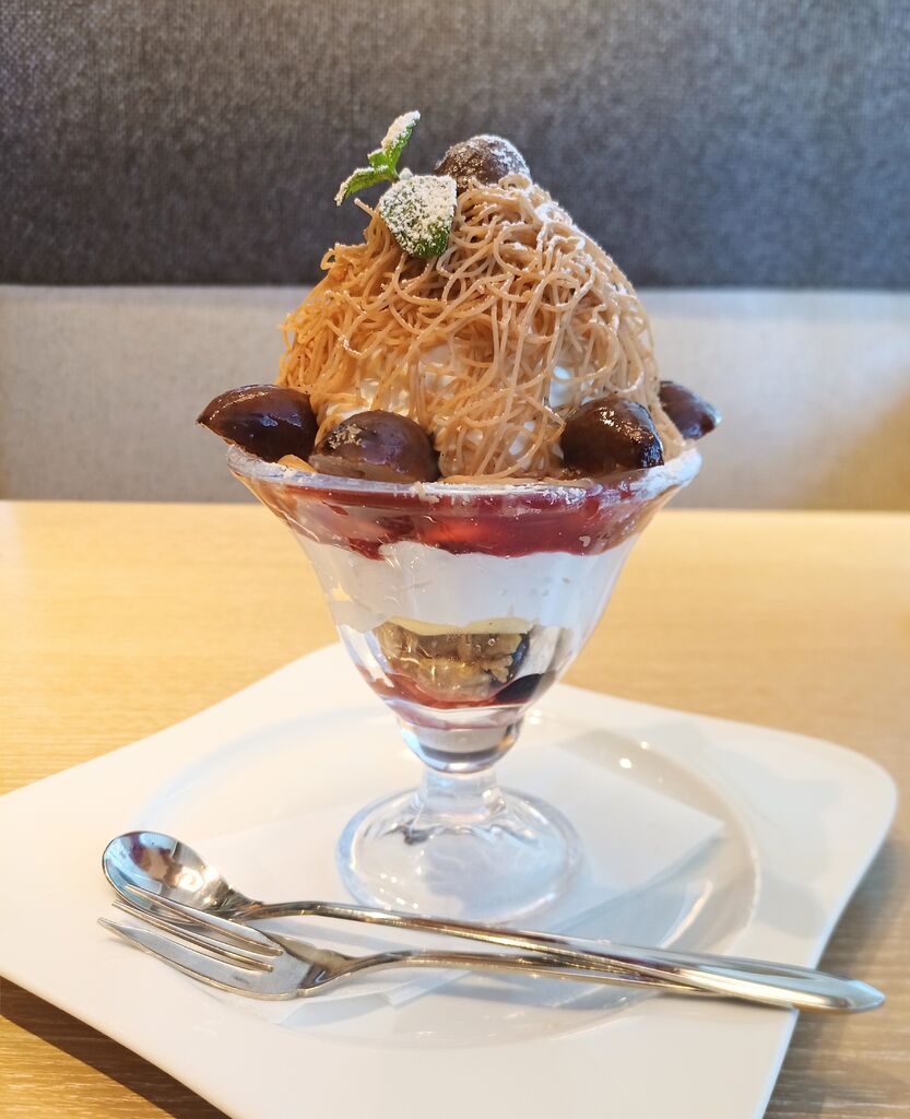 「絞りたてモンブランパフェ」「チェスナッツラテ」を注文しました。パフェはイタリア栗のマロンクリームがたっぷり使用されています。濃厚なチョコレートアイスとバニラアイス、たっぷりのホイップクリームが入っています。半分より下には甘酸っぱいフランボワーズソースの味が広がり、モンブランとは違った味わいになっています。チェスナッツラテはエスプレッソのコクと香ばしさが楽しめます。ふんわりミルクが優しい味わいで苦味は気になりません。別添えのナッツを好きなタイミングで入れられるのもよかったです。