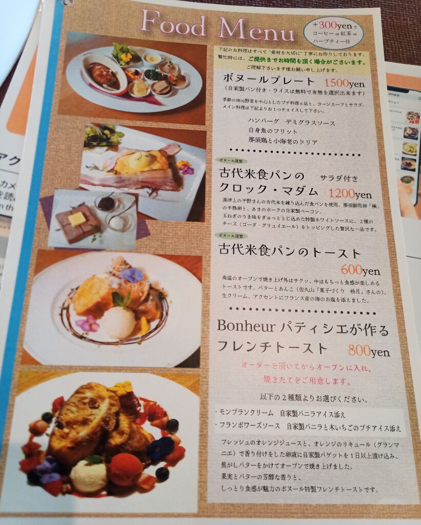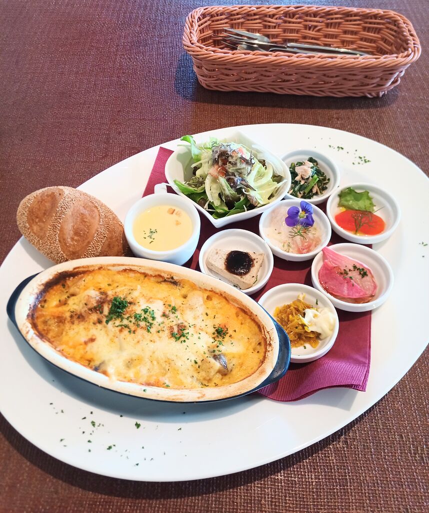 「ボヌールプレート」を注文しました。パテ、赤カブのマリネ、春菊ツナあえ、カルパッチョ等がちょこんと小皿に盛り付けられています。色んな種類を少しずつ食べたい方に嬉しいセット内容です。メインのドリアはぷりぷりのえび入りです。下のご飯はケチャップライスでした。パンはクランベリー入りでこれもまた美味しかったです。無料でライスをつけることもできるそうです。パンがついてくるしドリアにご飯が入っているので私はつけませんでしたが、ボリュームたっぷりでお腹いっぱいになりました。ポイントも使わせていただき、ありがとうございました。