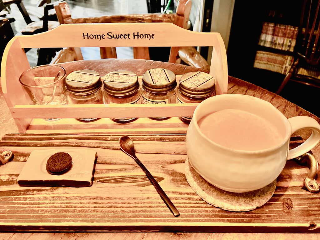 昭和の雰囲気漂うお店です(^^)それぞれ違ったテーブル席、カウンターも座りやすそう!お酒やタバコの種類が豊富。タバコを販売してることもあり、外には喫煙所があってタバコを吸うお客様は、出たり入ったりされてました。喫煙者にとっては、有り難いお店なのだと思います^_^本も沢山ありますよー♪さて初訪問でのドリンクですが、やっぱり大好きな【ロイヤルミルクティー】にしました。一緒にスパイスが4種類も運ばれて来て香りで1番気に入った《フェンネル・グローブ・シナモン》がブレンドしてあるモノに決定!香りが柔らかく仄かですが、ミルクティーに混ぜるとミルクティーの美味しさがより増す感じです。これは、イイですね❣️色々試せるし楽しくなります⤴︎⤴︎もう少し気温が上がったらアイスコーヒーもいただきたいですね(o˘◡︎˘o)♪︎