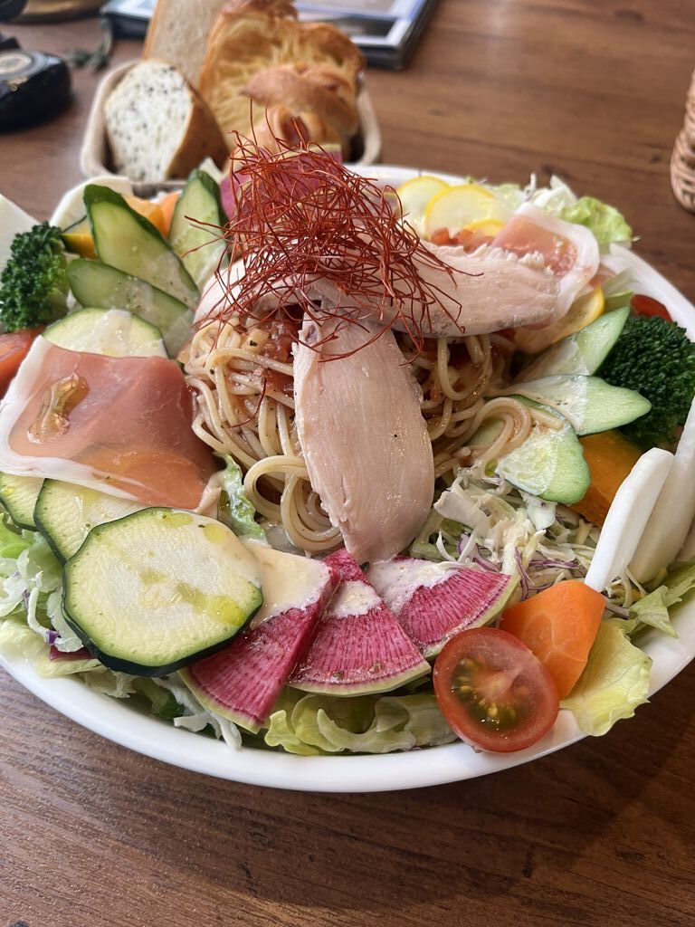 ランチに行ってきました。予約していなかったので、オープン前について、並んでました。お店の中は、素敵な雰囲気のオシャレな感じ。タッチパネルで注文。パンおかわりが目的だったので、あっさりとサラダパスタを選びました。運ばれてきたお料理にびっくり。すごい量でした。3人前はありそうなボリューム感でした。野菜の種類が豊富で、新鮮シャキシャキ。パスタもすごい美味しかったです。最初にパンが4つ、その後も2回おかわりを頼みました。焼きたてのパンを持って来てくれるので、美味しかったです。ゆっくり食べることができて、コーヒー飲みながら、楽しい時間を過ごさせて頂きました。また、行きたいです。ご馳走様でした。