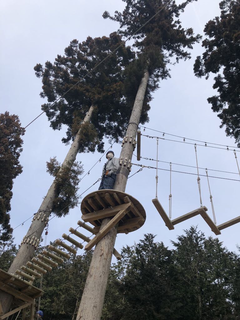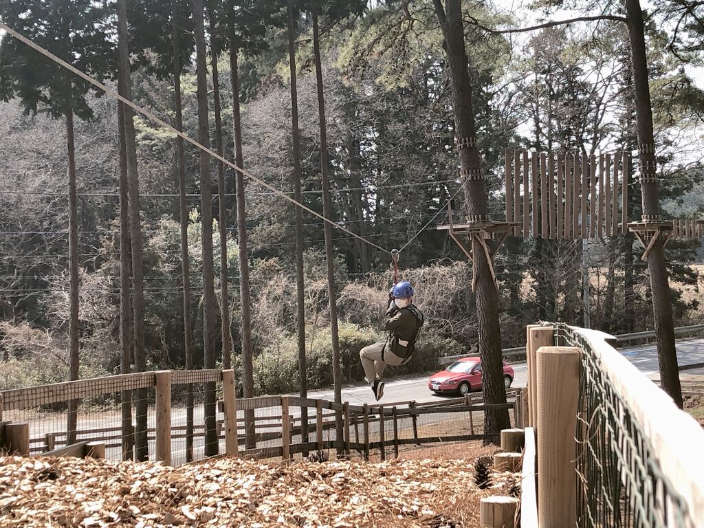 天気の良い日。日頃の運動不足をなんとかしようと58ロハスクラブの入口すぐにあるワイルドフォレストワン アスレチックにチャレンジ!息子は学生料金の3600円(5コース+ジップライン1回追加付き)、私はハイコース(3コース)3000円で、約2時間しっかりがんばりました。高くてガクブルしながら写真を撮ることになるので、カメラケースや深いポケットなど携帯が落ちない工夫をすると良いかも。ハイコースでもジップラインが3回も楽しめます。予約はオンライン、会計は現地でOK、各種キャッシュレスも使えて便利!受付、インストラクターのお兄さん達もとても親切でした。