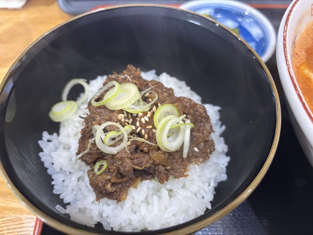 ずっとずっと前から気になっていたお店にやっと訪問出来ました♪開店5分後に到着しましたが、駐車場は満車に近く、入店すると直ぐ前に入った方で満席になってしまいました。名前を書いて待つことに。少しして席に案内されました。注文はもちろん一番人気の「和牛カルビラーメン」です!プラスまかない丼も♪タブレットでメニューを選び、麺の量、辛さ0〜10、トッピングそしてセットの選択と細かく入力して終了!そしていよいよ着丼、赤いスープにふわふわ卵ニラやネギそして、カルビ肉が3個入り甘味のあるピリ辛でとっても美味しいです♪麺は、ちぢれ麺の硬めです。まかない丼のしぐれ煮も美味しかったですよ♪今回、【栃ナビ!】ポイント交換チケットを利用させていただき、お得に食べることが出来ました!ありがとうございました。