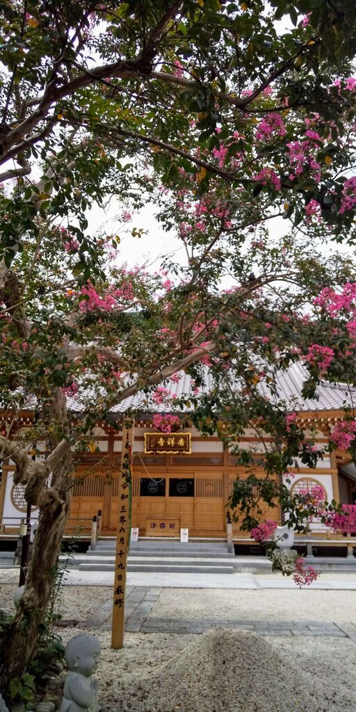 駐車場付近にチョコンと小さなサルスベリがあります。年端もいかない木ですが後ろの御堂を引き立てておりました。駐車場から上を見上げると5本のサルスベリが連続して植栽されておりお寺に来る人を歓迎しているような感じに見えました。ホテルのドアマンのようで気分がいいです。そして弁天様を囲むようにあるサルスベリ3本がメインです。本堂前に花咲く樹齢130~150年の古木の2本は仲が良く連携プレーです。花が重なりあい美しさが倍増しておりました。伝教大師像側の樹齢100年のサルスベリは本堂に被らないように彩りを加えておりました。弁天池には小さなスイレンが咲いており私も忘れないでと言っているようです。コレダケの豪華な顔ぶれに囲まれ弁天様は嬉しくてしょうがないんではないかなあと思いました。