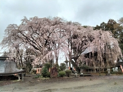 稲毛田の崇真寺です。芳賀町観光協会主催の桜の名所を巡るデジタルスタンプラリーで訪れました。本日6か所目です。シダレザクラが見頃を迎え競うように咲いていて華やかな境内です。その中でも昔話に出てくる犬切不動尊の側で咲く推定樹齢300年のエドヒガンのシダレザクラ(芳賀町天然記念物)は八方に枝を垂れていることから通称「たこザクラ」とも言われて親しまれております。幹が折れていて痛々しい姿の木ですが毎年枝一杯に花々を咲かせてくれております。今年も「たこザクラ」の本領発揮の雄姿を見る事が出来ました。
