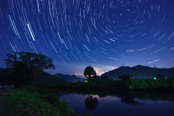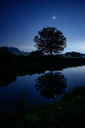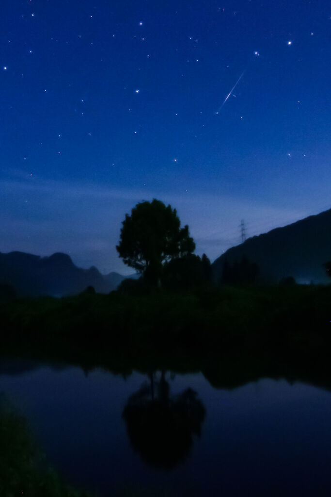 日中ものすごく暑かったこの日、夕立来るかなーなんて予想に反し、実に久しぶりに雲ひとつない満天の星空が広がりました。折しもペルセウス座流星群極大&夏休みイブとくれば、黙ってるわけにはいきません。てなわけで、笹原田のいつものスポットへ足を運びました。夜になっても暑さは続いていたのですが、川辺に吹く風はどこまでも心地よく、快適な星空観察を楽しむことができました。何よりこちらの魅力はこのロケーション。どの方位を向いても絵になる景色を堪能できます。この日は時を忘れて3時間。21個の流れ星、月明かりの飛行機雲、昇りかけの金星や遥か日光連山の遠雷を楽しむことができました。1枚目、控えめな流れ星、見えるかなー。鹿沼市内から気軽に行ける星空スポット、おすすめです。