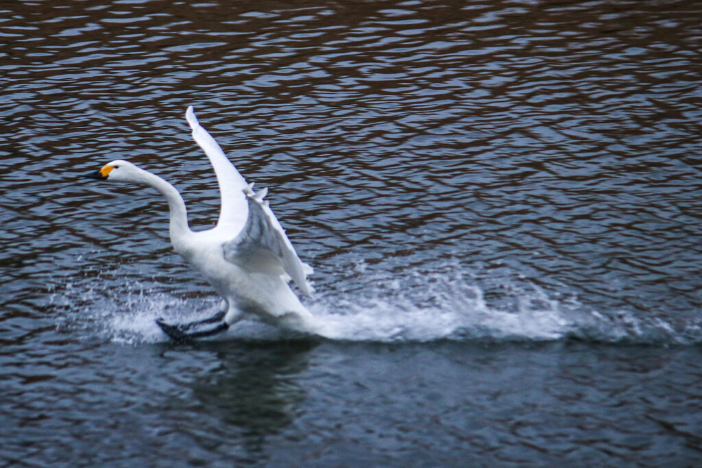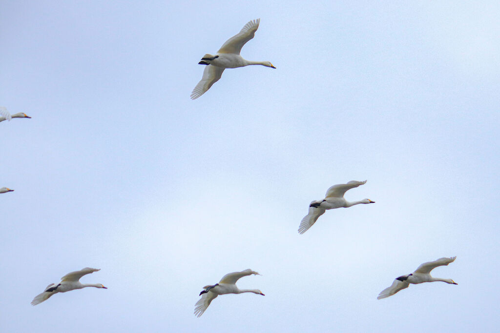 昨年秋頃からの皆さまのクチコミで、今シーズンも白鳥たちが帰ってきてくれたことを知り、ずっと足を運びたかった黒川の白鳥飛来地。この日ようやく訪れることができました。朝からどんより曇り空。楡木を過ぎた辺りから小雨がぽつぽつ降り始め、白鳥たち、今日はじっとしてるかもねーなんて話しながら到着するやいなや目に飛び込んできたのは、飛び立っては上空を旋回し元の川面に着水する白鳥たちの姿。これには僕たち家族だけでなく、多くのギャラリーの皆さまも歓声を上げる見事な光景でした。毎シーズン訪れていますが、飛んでいる姿を見たのは今回が初めて。すごいすごい感動的な午後のひと時となりました。そんな様子が写真から少しでも伝われば嬉しいです。おそらく春先までは白鳥たちの優雅な姿を楽しめるはず。皆さまも是非足を運んでみて下さいね。