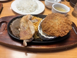 久々に来ました。平日限定ランチ税込¥980(ライスバー、スープバー付)を選択!内容は、チキングリル120g &カニ入りクリームコロッケ、チキングリル120g &牛メンチにしました。さらに、ステーキ宮に来るといつも頼んでしまうランチサラダバー¥649を追加注文。この店、とにかく広いバー周り!1つ1つにゆとりがある。今日のいちおしスープは、春のキャベツとあさりのスープ。柔らかいキャベツと魚介の香りが春らしくて、温かい気持ちになります。サラダバーの季節商品として、パプリカとアスパラのマリネ、菜の花と鶏肉と茄子の黒酢餡、たまごポテトサラダ、紫キャベツマリネ、ベリーゼリーがありました。料理のほうは大きな牛メンチ!熱々クリーミーなクリームコロッケ。チキンは柔らかくてすぐ解れる。やみつきのタレの味付けこそがライスが止まらない原因。多くの店員がテキパキと働いており、みなさん愛想よく丁寧な接客なので食べる側としても気持ちが良いです。提供寸前に、店員さん自らタレをかける演出含め、ステーキ宮ですね。サラダバーに、惣菜やパスタ、スイーツまで揃っているから、期待以上に満腹になることができました。