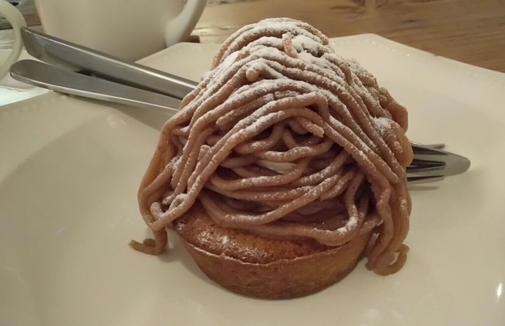 お茶の時間に伺い、ヘアスタイルがナイスなモンブランを頂きました。土台の部分はザクザクとしたタルト生地になっており、ナイフとフォークで切りながら頂きます。甘くて優しい栗の味、とても美味しいです。一緒に注文したジンジャーティーもとても美味しく、しょうがパワーで体が温まりました。なんだかホッとするお味です。たっぷりカップ2杯分いただけます。外は寒い日でしたがストーブの効いた温かい室内で、美味しいスイーツと温かいお飲み物を頂き、贅沢な冬の午後を過ごせました。ありがとうございました!