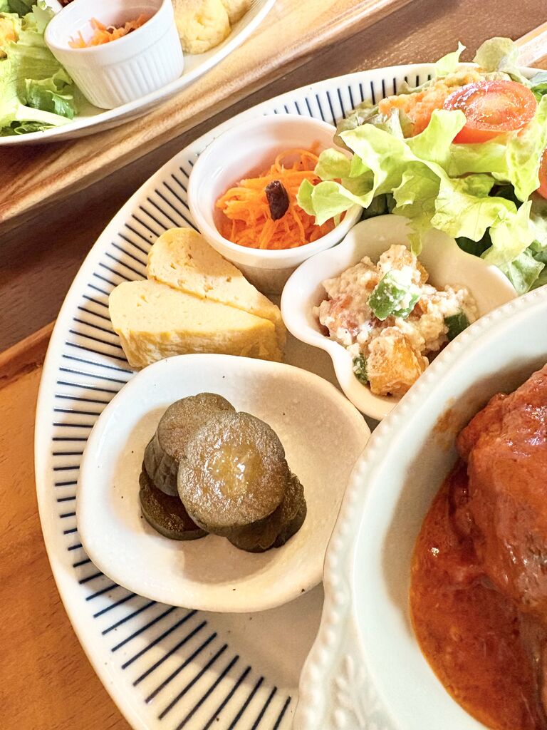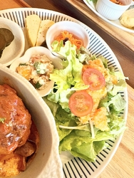 友人とランチで伺いました。2週替わりランチに決定♪トマトクリームハンバーグ、人参ラペ、柿の白和え、手作りきゅうりのQちゃん、だし巻きたまご、無農薬サラダ、いろいろ米入りごはん、お味噌汁、ホットコーヒー、いろいろなお料理がいただける嬉しいランチ^ ^ドレッシングも手作りされていて、どれも優しいお味、まさにこの日はこういうのが食べたかった〜!素敵な店主さんに木の温もりがあるかわいいログハウスにほっこりです^ ^美味しく楽しいひと時にまたいろいろ頑張る活力となりました♪次はスイーツ系もいただいてみたいです!