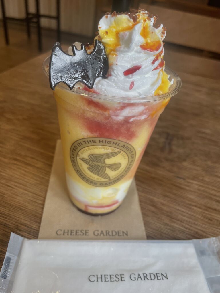 チーズガーデン本店の右奥にあるカフェが好きです。季節ならではメニューと落ち着いた雰囲気。フリーWiFiも気に入ってます。今日はハロウィンならではのドリンク。パンプキンカシスフローズンフロマージュ。少し名前が長いです。(笑)パンプキン、チーズ、ミルクのフローズンにパンプキンとカシスのソース。そしてホイップクリーム。ローストチョコとコウモリチョコをトッピングです。かぼちゃの甘味、カシスの酸味。チョコのほろ苦さと甘さ。ストローで混ぜながら飲むと、色々な味が現れて楽しめます。ハロウィンの雰囲気も楽しいですね^_^