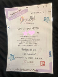 ヘアドネーションをするために来店しました。とても親切な対応でした。カットだけと思っていたら、シャンプーまで丁寧にしていただきました。初めての来店の美容室だったので緊張していましたが、フレンドリーに話しかけてもらってよかったです。写真撮っていいですかって聞いたところ、撮りましょうかって言ってくれて嬉しかったです。ヘアドネーションの料金も4,950円+送料600円と合計で5,550円とリーズナブルでしかもゾロ目笑嬉しいなにかいい事あるかもって思っちゃいました。その後、ヘアドネーションの認定証が届きました。認定証をいただくとヘアドネーションした実感があり、とても嬉しく思います。ありがとうございました。また、ヘアドネーションする機会がありました時にはよろしくお願いいたします。