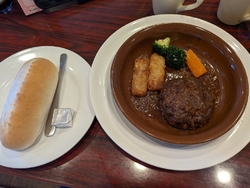粗挽き肉厚ステーキ風ハンバーグとライスドリンクバーセットをいただきました。ライスドリンクバーセットはソフトフランスパンに変更しました。待ち時間10分程で到着したお料理は超熱々。肉感たっぷり。厚みもあるので超満足。すごいおいしいです。たっぷりかけられたオニオンソースが、お肉のおいしさを引き立てています。ボリュームあって極旨ハンバーグ。ソフトフランスパンもほんのりと温かくておいしい。ハンバーグと相性抜群のパンです。ドリンクももちろんたっぷりいただきました。日替わりのスープもとってもおいしかったです。ちょっと遠いけど、通いたくなるお店です。