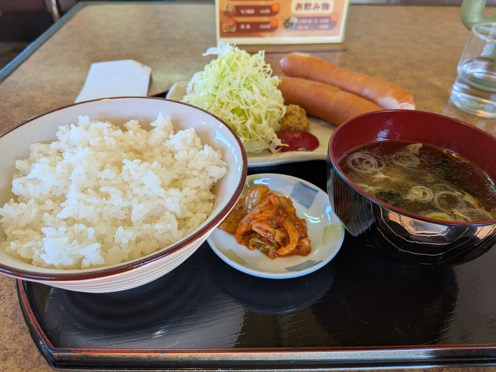 ビッグウィンナー定食をいただきました。定食メニューはいろいろあるけど、この名前の定食って初めて。しかも、お値段!二度見必死のお値段です。なので。迷うことなくこちらをお願いしました。待ち時間は10分弱。出て来たお料理に圧倒されました。ごはんの盛り、素晴らしい!ウィンナーでっかい!!ボリューム満点です。スープ、熱々でおいしい。温まります。キムチも美味しい。このキムチだけでごはん完食できそうです。盛り盛りごはん、凄いおいしいごはん。頬張って食べる瞬間、最高です。キャベツもしゃきしゃきでおいしい。そしてウィンナー。皮の食感が心地いい。ジューシーウィンナー、おいしいです。このタイプのウィンナ―、久しくいただいてないので、凄い幸せ。店内はアットホームな感じで、程よいレトロ感。角煮も好きなので、ぜひ頂きたいです。