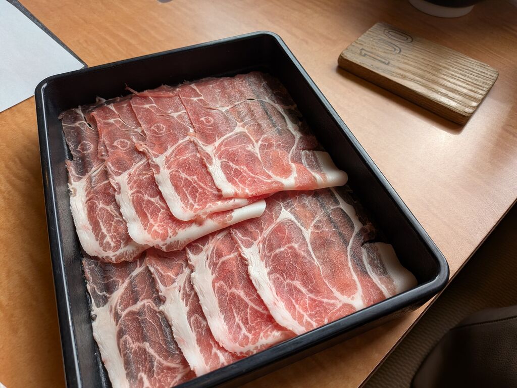 久しぶりにお邪魔しました。いただいたのは豚ロース定食(税込み1,309円)。土日祝もOKのランチメニュー。お値段にびっくりしたのに、ごはん・太うどん・中華麺はもちろん、たまごまで食べ放題。ますますびっくりです。すき焼き・しゃぶしゃぶは値が張ると言うイメージが根底から崩れました。しゃぶしゃぶメインのお店ですが、すき焼きをいただきました。それなりの長期間生きてるけど、すき焼きって、食べたことがほぼない。食べ方は知ってはいるけど、不安いっぱいでした。でも、丁寧な説明のカードが付いて来て、不安も解消。ゆっくりといただくことができました。鍋に具材入れた時の、”ジュ―”っという音、それでなくても爆発している食欲が、ますます爆発。たまごと太うどんをお替りさせていただきました。たっぷりのお肉とお野菜を、じっくり焼いて煮込んで甘辛味の割り下を沁み込ませて、めっちゃくちゃにおいしかったです。外は雪ですが、駐車場には車が次から次へと入って来ます。安くて美味しくてボリュームたっぷり。目からうろこが落ちるお値段だし、食べればほっぺが落ちる超ありがたいお店です。