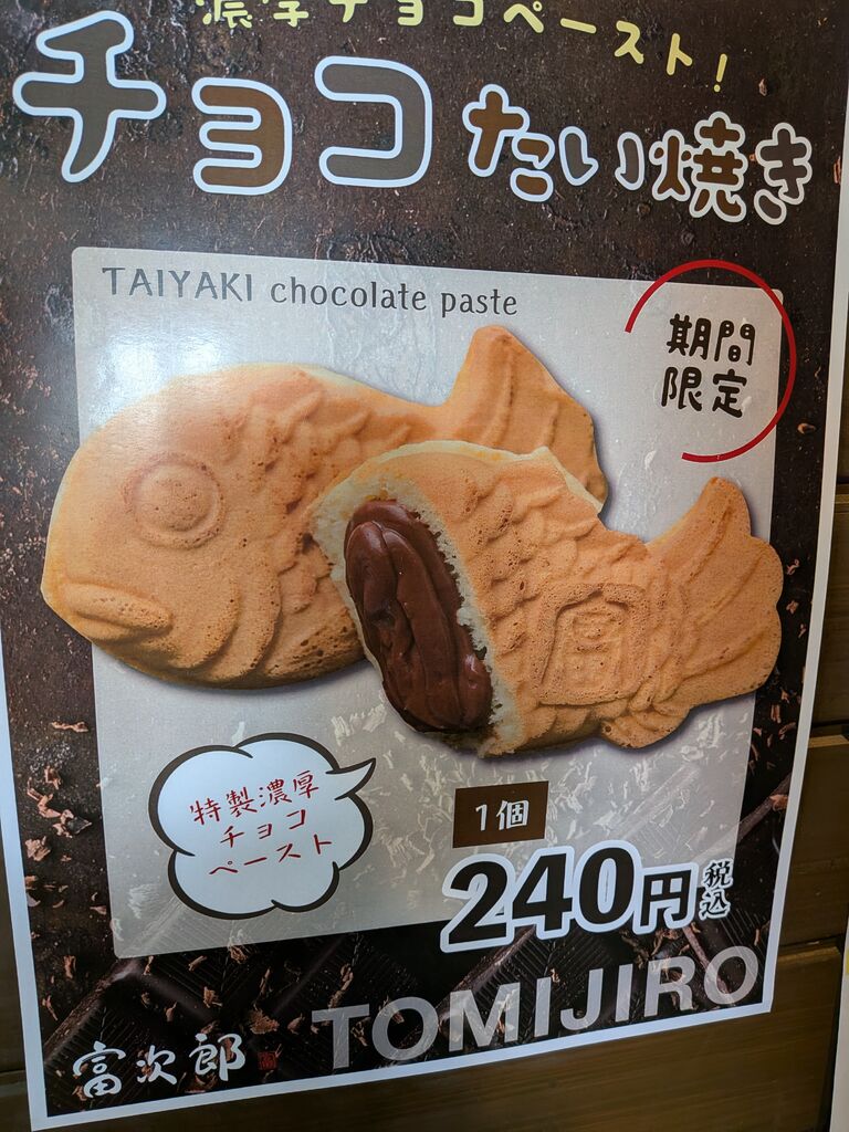 チョコたい焼き・おいもたい焼きをいただきました。チョコたい焼きは期間限定、おいもたい焼きは季節限定。限定って言葉、引力強いです。お店に着いたのは11:30頃。日曜日なのでお客様たくさんいるとは思っていたのですが、最後尾が分からない位の列にびっくりです。暖かい日でほんとに良かった。いただいたチョコたい焼き。チョコがとろっとまじ濃厚。しかもたっぷり。零れ落ちそうな量です。おいもたい焼きも、超おいしい。とっても優しいべにはるかの甘み。チョコたい焼きを食べた後だったので、味覚麻痺してるかと思ったのですが、その優しい甘みに、とても癒されました。チョコたい焼き・おいもたい焼き、どちらも限定なので、間もなく終了してしまうのがとっても寂しい。終了するまで通いたいと思います。