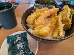えび天と季節の天丼(シャリ)と青さ入り味噌汁をいただきました。青さ入りの味噌汁、蓋を開けた時の香り、すばらしいです。もちろん美味。温かい御味噌汁、凄いおいしかったです。天丼も、えび天が3尾も乗っていて、びっくり。白身魚の天ぷらも、海苔天も、しそ天も、ころもがさっくさくで、とってもおいしかった。別添えのタレもたっぷり。たっぷりのたれとシャリのコラボは極上のおいしさ。大根ガリもおいしいです。大根は体にもいいし、食感最高。無限に食べていたいほどにおいしかった。久しぶりにお伺いしたので、新しいメニューがたくさんありました。くら寿司さんならではの豊富なメニューいただきに、またお伺いしたいです。