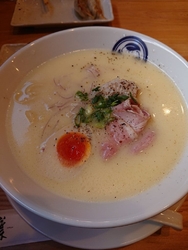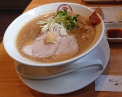 宇都宮の二荒山神社へお参りの帰りにドンキホーテ(東側)向かい路地に入ったところにお洒落な品のある外観の『一葉』さんを見つけました。感染症拡大対策の為、外で名前を書いて順番待ち。店内は、今や当たり前となった、食事以外マスク着用。本日私が頂いたのは、『鶏白湯ラーメン』(私にとっては初めての味)と『餃子』。スープはややクリーミーな感じあっさり塩味。麺は細麺でした(*^▽^*)美味しかったです☆主人は期間限定の味噌ラーメン。麺は太麺。スープが好きな私は味見をさせてもらいました。私が頂いた鶏白湯よりあっさりしていましたが味噌の味で、美味しかったです☆