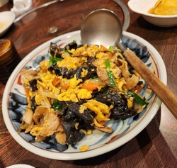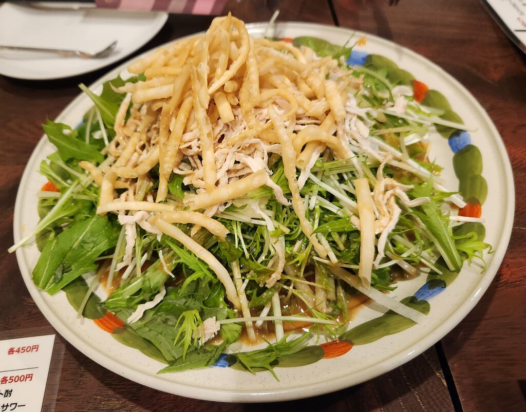 栃木市勤務の時に入っていた社会奉仕クラブのOB達と30年ぶりにお会いすることができました。注文は「スタミナ肉野菜炒め 800円×2」「刺身3点盛り 1,650円×2」「蒸し鶏と水菜のサラダ 660円×2」「山いも梅肉あえ 450円×2」「揚げ出し豆腐 520円×3」「木くらげ卵炒め 680円×2」「ギョーザ 520円×3」「枝豆 410円×2」「手羽先 670円×3」「バニラアイス 240円×3」「揚げたい焼き 300円」ドリンクは途中からメガジョッキに。しゃぶしゃぶが有名みたいですが中華系のおつまみも全部美味しかったです。