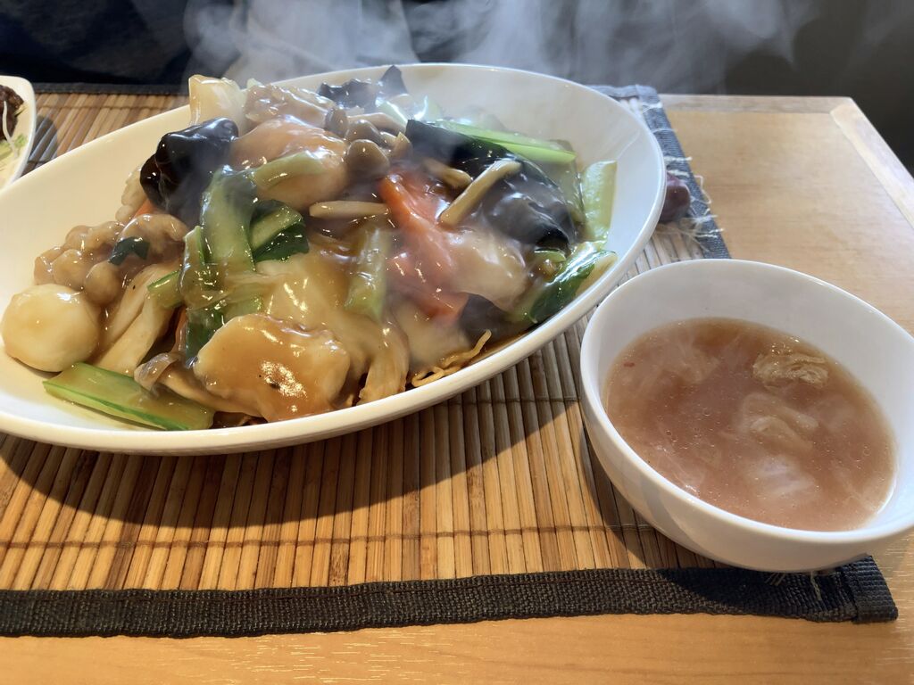週末ランチで「ジャージャー麵」と「五目あんかけ焼きそば」を注文しました。「ジャージャー麵」は麵の上に肉みそ・きゅうり・ナッツ・揚げナス・白髪ねぎが美しくトッピングされ映える見た目です。「五目あんかけ焼きそば」は、かた焼きそばに豚肉・イカ・海老・うずら卵等具沢山のあんかけがかかりスープが付きました。テーブルの上の取り皿でシェアしていただきましたが、どちらのメニューもとてもおいしかったです。皆さんの口コミで気になっていた1皿分盛れるビュッフェの前菜はこの日は7種類かな、一つ一つ丁寧に作られていて野菜たっぷり、ついつい取りすぎてしまいますね。デザートのリンゴの杏仁豆腐とタピオカミルクも優しい味でおいしくいただきました。初めて伺いましたが店内はおしゃれで落ち着いた雰囲気、ゆったり食事が楽しめました。