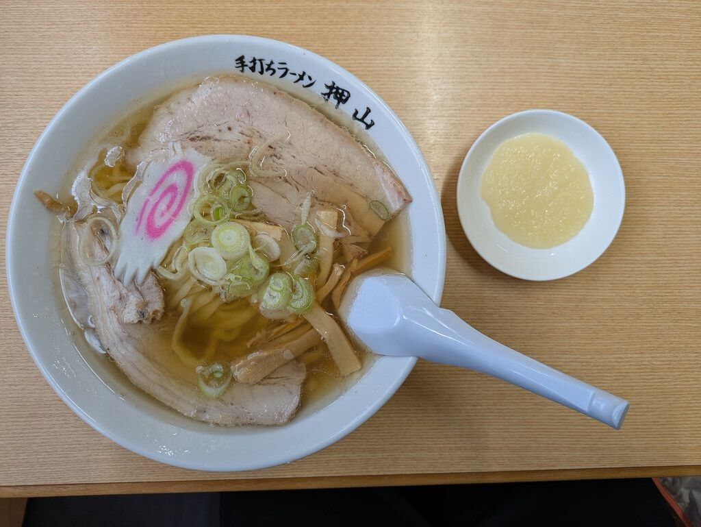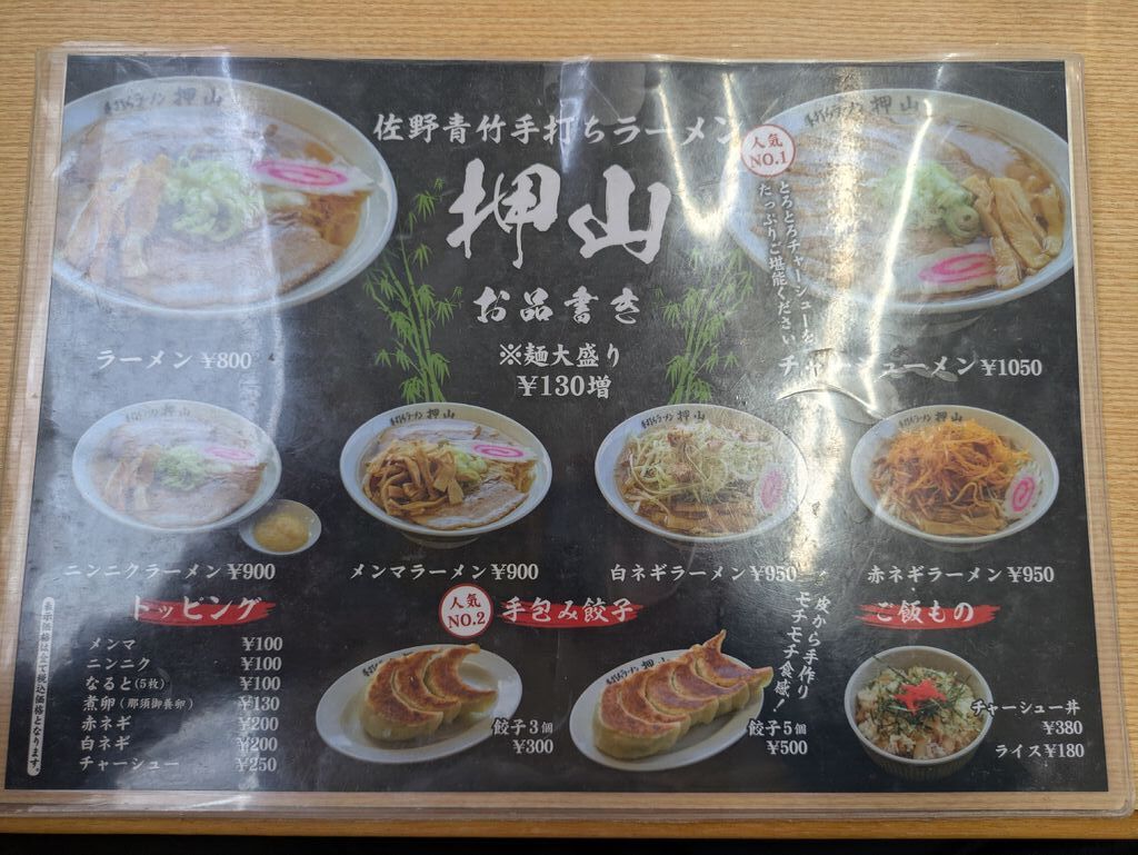 佐野ラーメンは、あちこち行きましたが、押山さんは初めてでした。佐野ラーメンのスープは、薄味のお店と濃い目のお店があります。押山さんは、どちらかというと濃い目の味で、私は好きです。ラーメンは、基本一種類ですが、トッピングがたくさんあり自分好みに変えることができます。メンマ、ニンニク、白ネギ、赤ネギなど色んなバリエーションが楽しめます。餃子もとてもおいしかったです。1個の大きさがとても大きいので、3個でもお腹がいっぱいになってしまいました。皆さんもぜひ行ってみてください。