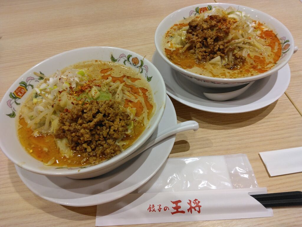 念願の「餃子の王将」に初来店ヾ(≧▽≦*)o 自宅から1番近いお店も多分ここなので、ほとんどチャンスがなく、今日を迎えました°˖✧◝(⁰▿⁰)◜✧˖° 「野菜たっぷり担々麺」×2、「にんにく激増し餃子(3ヶ)」「餃子」(3ヶ)を注文◉_◉ 20:00くらいの来店でしたが、店員さんたちが元気に働かれていて、雰囲気良し(((o(*゜▽゜*)o))) そして、店内もとっても綺麗°˖✧◝(⁰▿⁰)◜✧˖° 豊富なメニューから、おそらく人生初になるであろう「野菜たっぷり担々麺」(❤️´艸`❤️) 香味辣油がピリッと効いて、肉そぼろもたっぷりщ(ʘ╻ʘ)щ 胡麻風味の白いコク旨スープに、良く絡む麺(≧◇≦) ザ・中華で、ヤケド注意の激熱OwO 店名の「餃子」は、初来店者としては、外せない逸品°˖✧◝(⁰▿⁰)◜✧˖° 中華料理を堪能して大満足(⋈◍>◡<◍)。✧♡ ごはんモノも気になるので、また伺いたいなぁ...☆*: .。. o(≧▽≦)o .。.:*☆